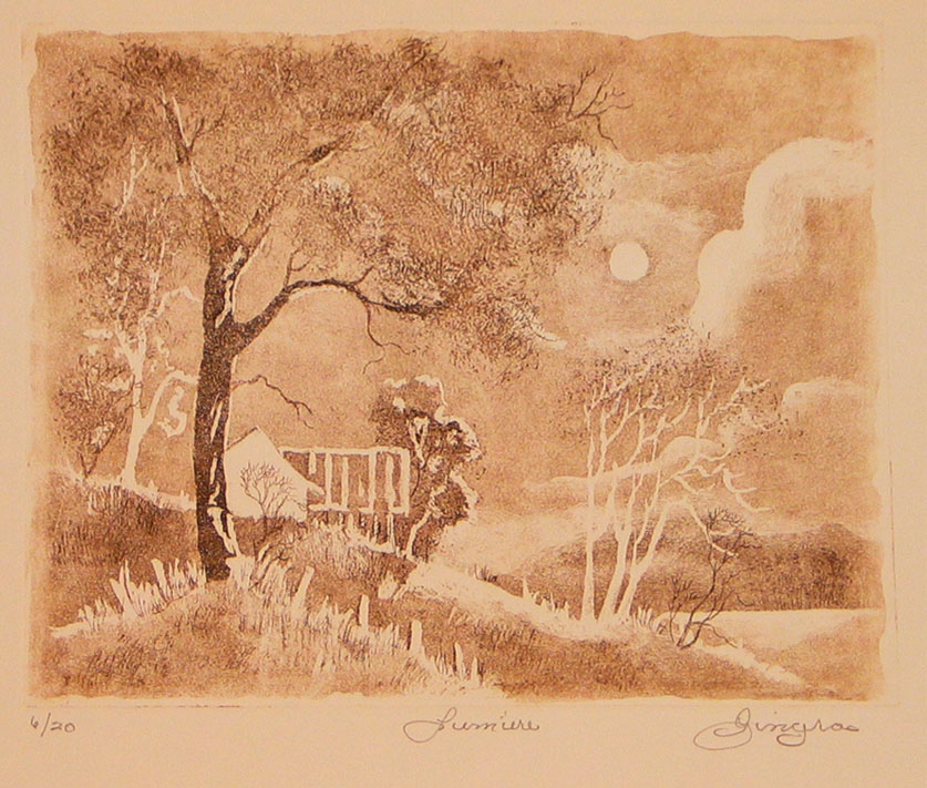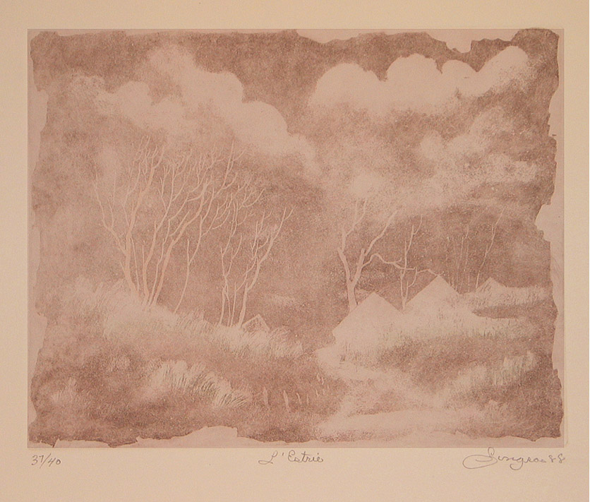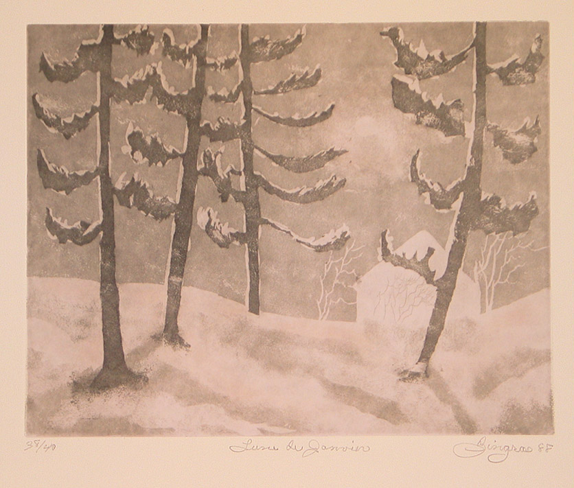 Les Gravures by Gilles on December 31, 2018 in Gravures / Etchings Gilles Émanuel Gingras 1932-2002: Discipline de la gravure à l'eau forte, Gilles-Emmanuel Gingras démontre une technique sûre, une flambée d'imagination qui ne passent pas inaperçues. Toutes les oeuvres sont originales et numérotées. Etching art fully mastered by Gilles Emanuel Gingras. A wild and overflowing imagination expressed through a convincing technique. Each art piece is genuine and numbered. Le thé Pleine lune Cathédrale Marie-Reine du Monde Lumière d'été Reflets d'automne Chemin Lotbinière Lumière Licornes Coup de vent Message La berge Divertissements Neigeux Monique Don Quichotte Avril Matin brumeux Fin d'été Lune de janvier Hudson La plage L'Estrie L'étoile L'Estrie (granges) Lac Bromont Les méchins Le voilier Martine L'Estrie Moulin à vent Détente d'un pêcheur - Nu Harmonie Nymphe Fantaisie Ombrage Janvier Promenade Doux souvenir Reflet de soleil Dégel Rêve bleu Brome Rivière de l'Estrie Chez Hélène Rivière Richelieu Chez Madeleine Rivière Yamaska Charme d'un soir Saint-Marc sur Richelieu Chez Monsieur Racicot - Septembre Début d'automne Sutton Automne Vers le lac Avec Marie Abercorn « ‹ of 2 › »